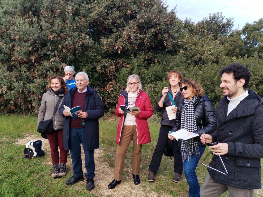Subito dopo con la guida esperta di Pietro Pantaleo, presidente del movimento ambientalista Pro Lama Balice, è cominciata una rilassante camminata lungo la lama tra la folta vegetazione fatta in prevalenza di ulivi, ginestre e canneti, dove qualcuno ha immaginato che un tempo fossero presenti dei dinosauri (le cui orme sono state effettivamente rinvenute in una cava). Durante il percorso ci sono state soste dedicate alle poesie su tematiche ambientali declamate dai poeti presenti dell’Isola di Gary (Luisa Parato, Mauro De Pasquale, Federica Introna, Letizia Cobaltini, Sandro Marano) guidati da Maria Pia Latorre, coordinatrice e curatrice dell’antologia “L’isola di Gary” giunta al terzo volume significativamente intitolato “Mutevoli grafie della Terra”. Alle voci poetiche si sono aggiunti i canti di Alessandro Patruno, che ritmava col tamburello, insieme all’estemporanea e ben riuscita partecipazione di Letizia Cobaltini e di Luisa Parato.