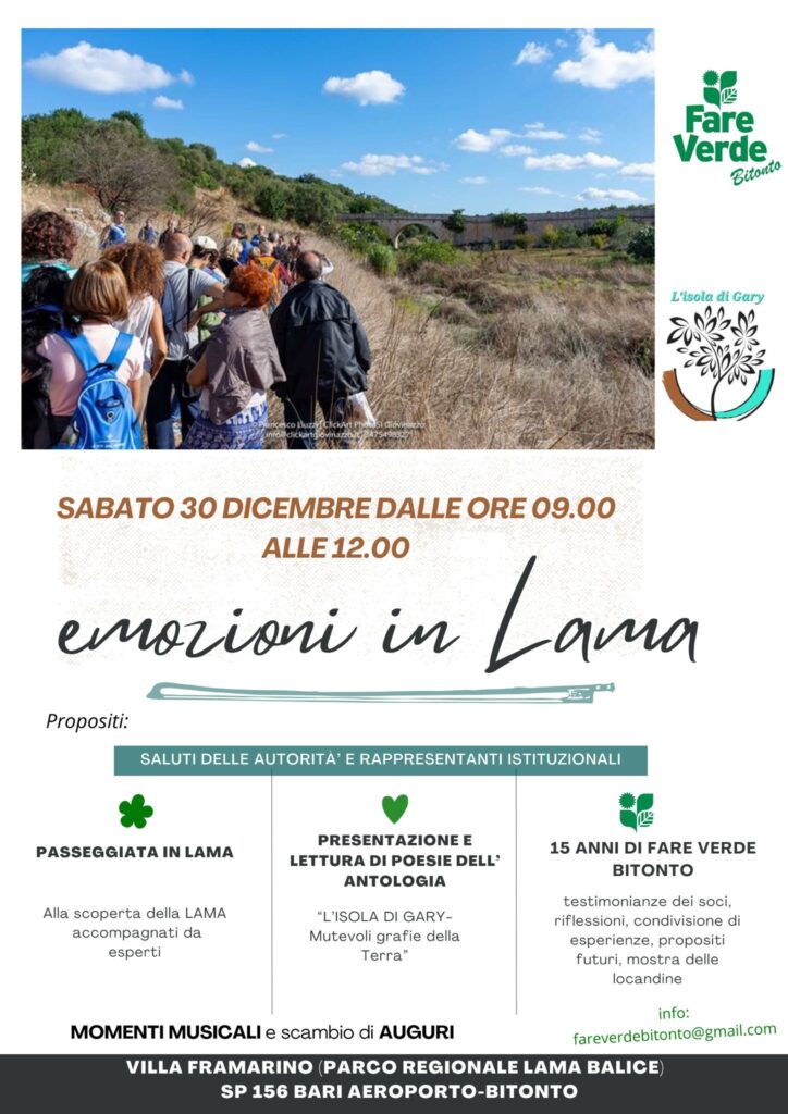 Organizzata da Fare Verde Bitonto in collaborazione coi poeti per l’ambiente dell’isola di Gary si è svolta nella mattinata di sabato 30 dicembre dalle ore 9 fino alle 13 la manifestazione “Emozioni in lama”. Punto di ritrovo per i numerosi partecipanti, tra cui una delegazione di Fare Verde Conversano, la villa Framarino, che è sede del parco regionale Lama Balice. Dopo i saluti dell’assessore all’ambiente del Comune di Bitonto, Giuseppe Santoruvo, ha preso la parola il responsabile di Fare Verde Bitonto, Beppe Cazzolla, che in occasione dei quindici anni della costituzione del gruppo di Bitonto ha illustrato brevemente le attività svolte, lo scopo della manifestazione e la necessità di ritrovare un’armonia tra uomo e natura.